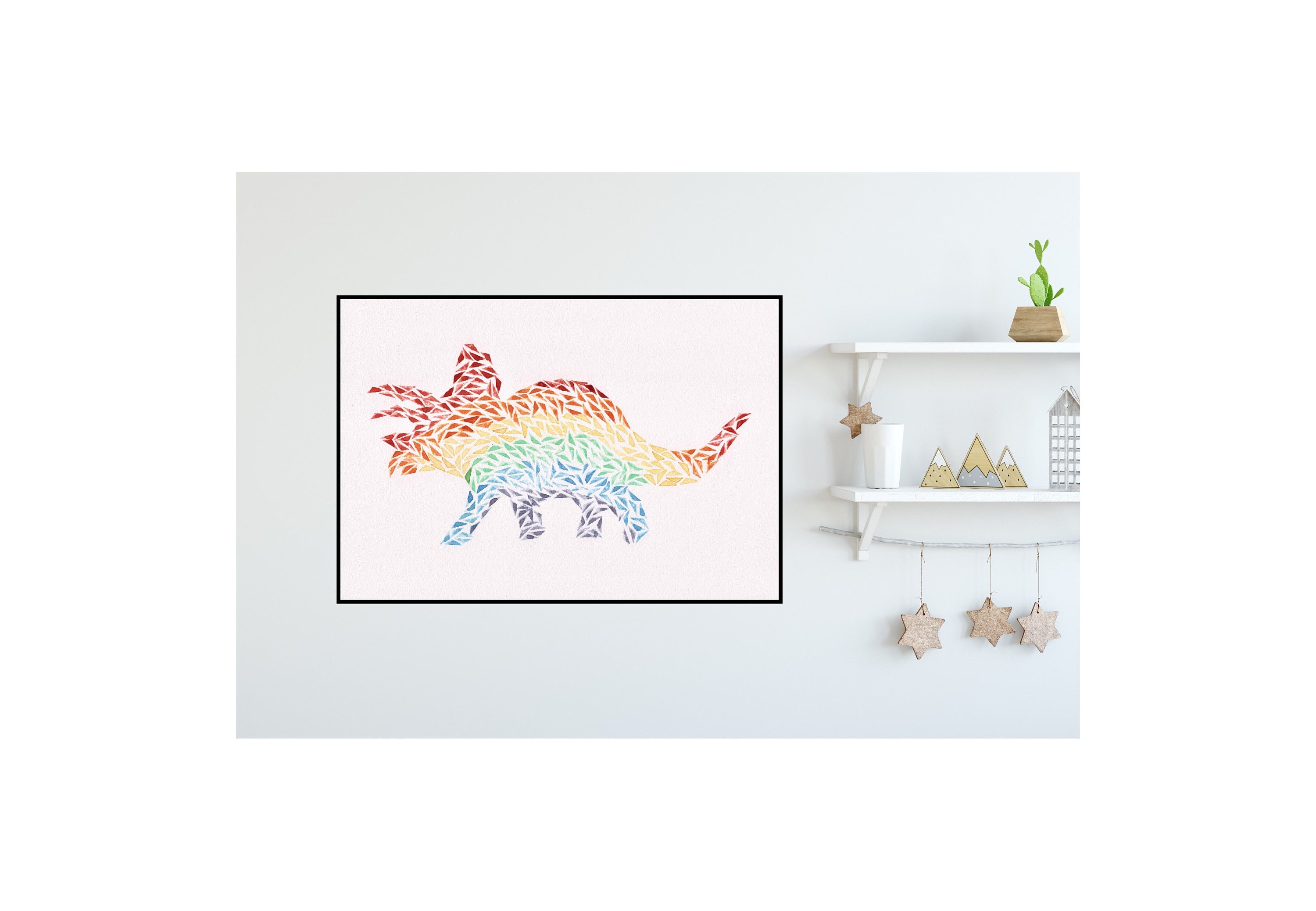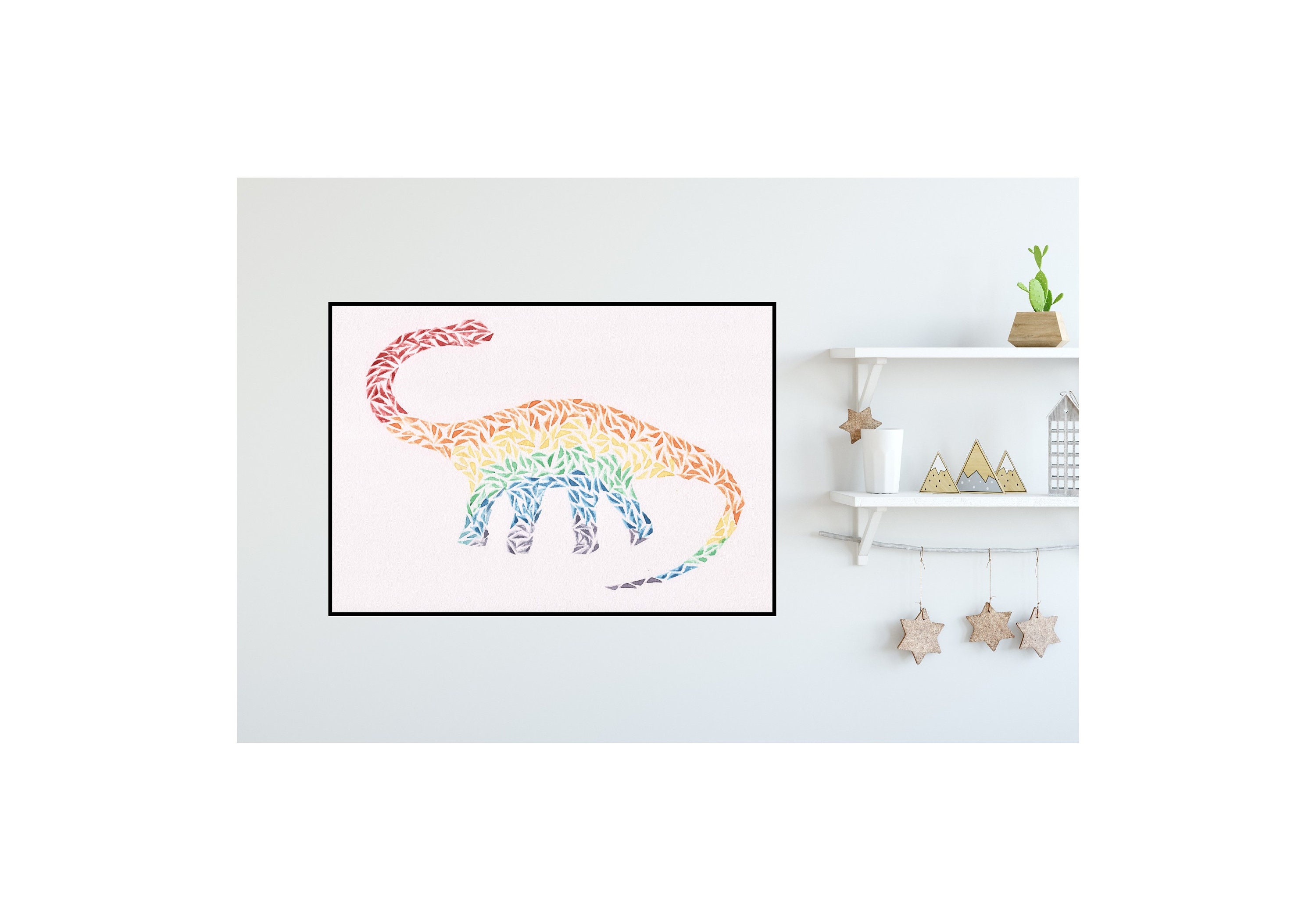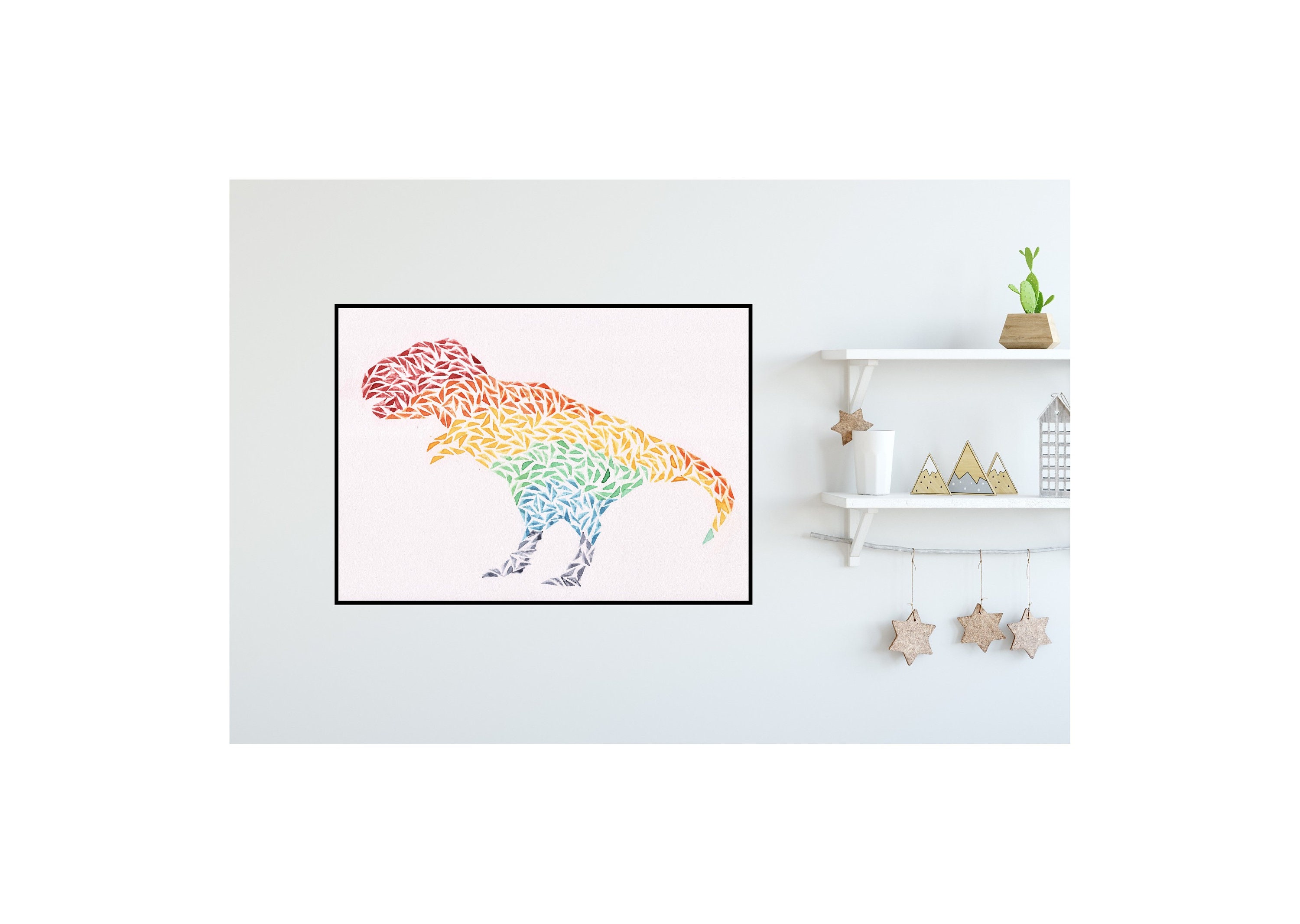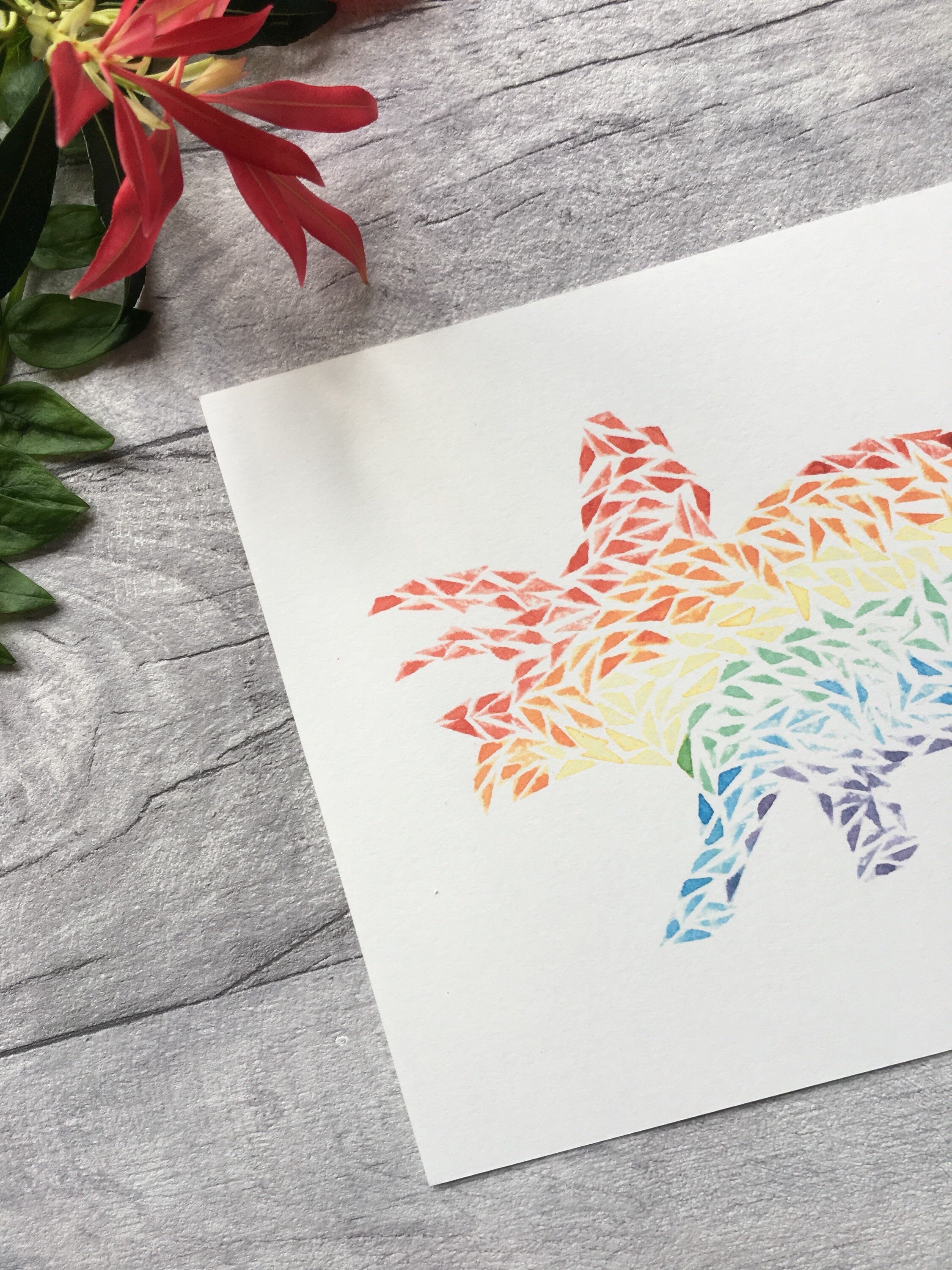 I have used a hand cut stamp to carefully print each little triangle. The triangles come together to form this awesome, rainbow dinosaur!